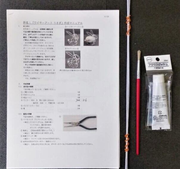 ラジオペンチの他に、細書マジック・物差しさえあれば、誰でも作成できる親切・丁寧な作成マニュアルと材料がセットになっていますので、安心して作成できます。セットには、「白色塗料」や「筆」も含まれており、更に、作り直しをしなければ、2羽の「うさぎ」が作成できる十二分の予備材料も含まれておりますので、2倍お楽しみいただけます。
