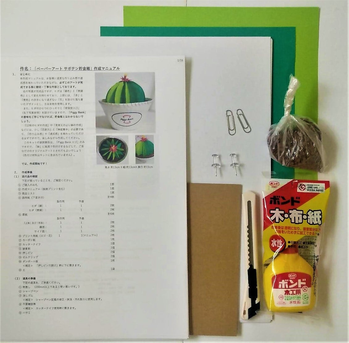 今人気の緑のサボテンを貯金箱にした、初心者向けペーパーアートキット(完成品ではありません)です。細かい内容まで記載した「親切丁寧な作成マニュアル」がキットに入っております。