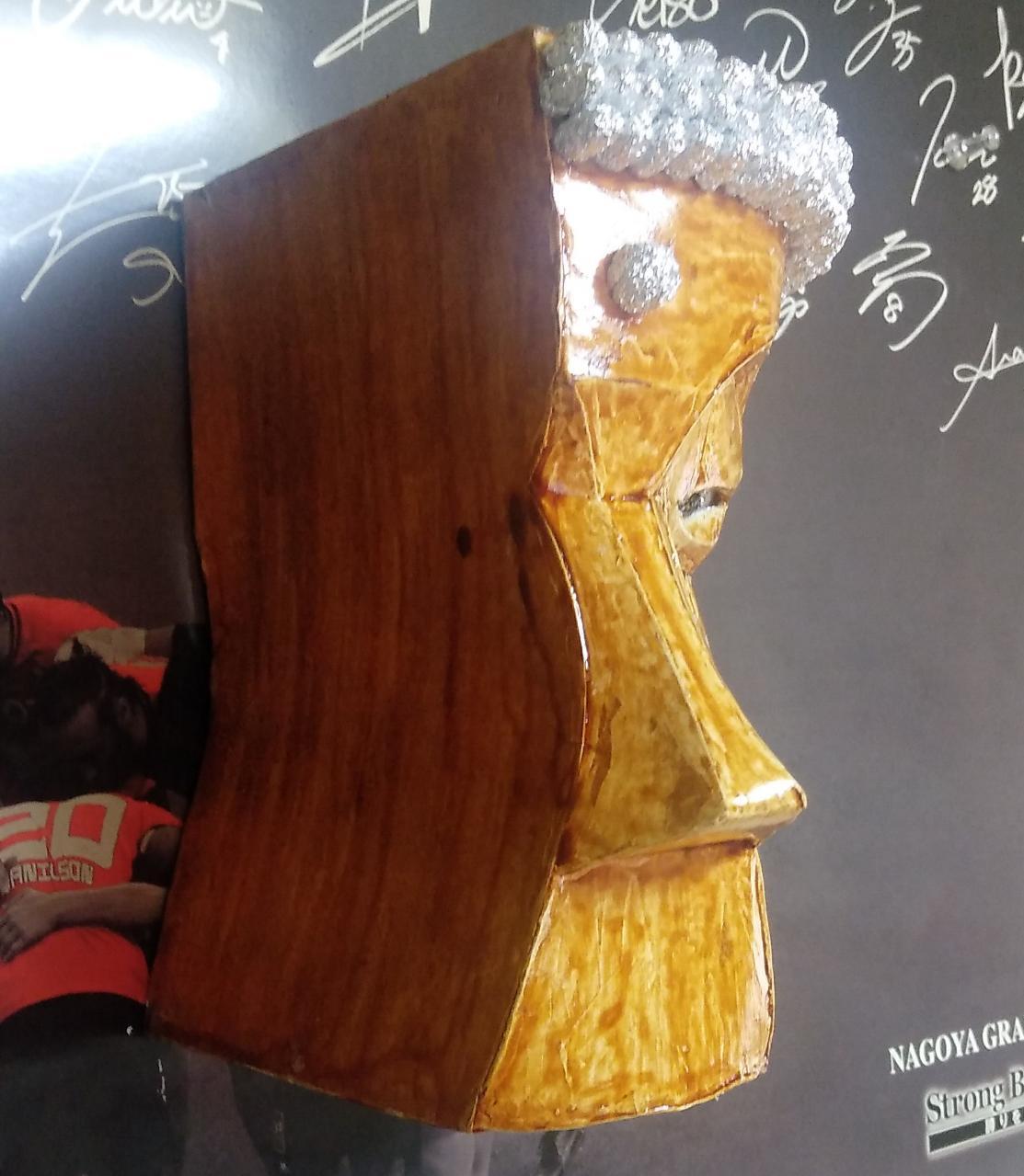押しピン一つで壁に掛けることができますし、自立させて展示することもできます。写真のとおり、曲面を有する3次元形状ですが、顔部(眼球部を除く)は、6枚の紙で造形できるように工夫したデザインしております。