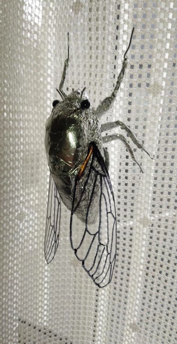 本物の約1.5倍のサイズで「銀色の全身」、「脈を反映した透明で曲面がついた『翅』」、「太さに変化を持たせた銀色の『脚』」としており、スタイリッシュでインパクトのある外観となっています。