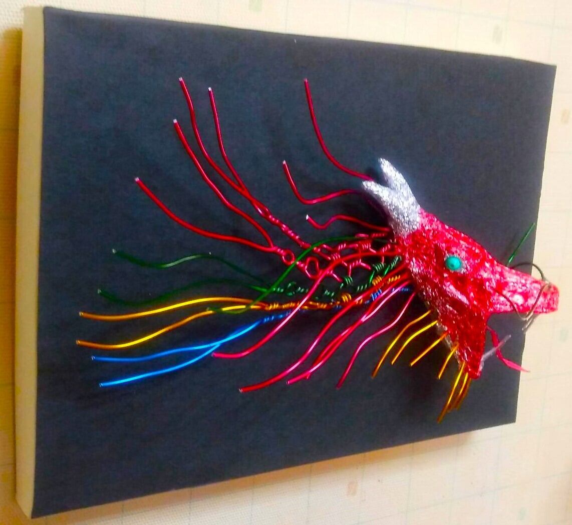 「20.4cm X 14.5cm X 1.5cm」の真っ黒なフレームに、流れを表現した4色の「ワイヤー」と「赤色に塗装した立体的なアルミホイルの頭部」を配した、初心者向けハイブリッドアートキット(完成品ではありません)です。「ハイブリッドアート」ですから、「ペーパー」、「アルミホイル」及び「ワイヤー」を組み合わせた「アート」であり、3つの「アート」を楽しんでいただくことができます。